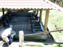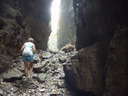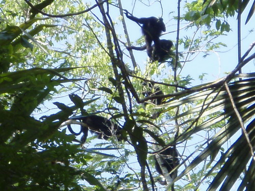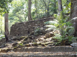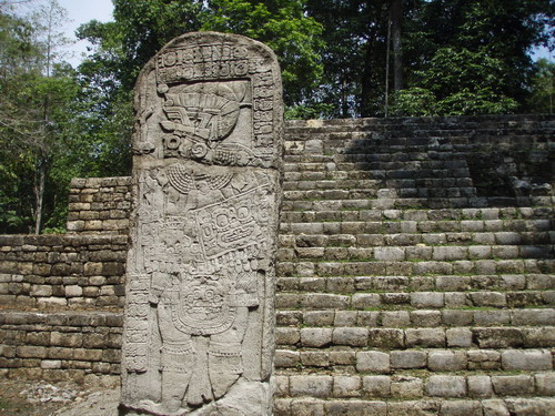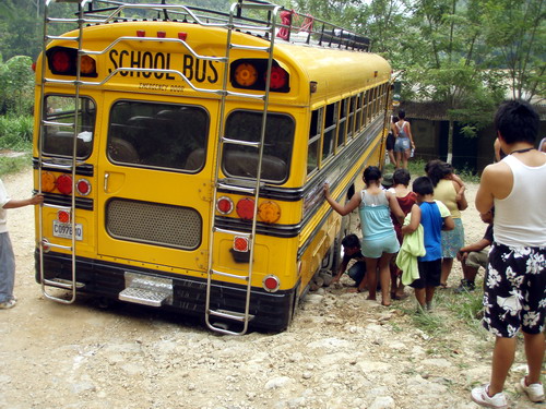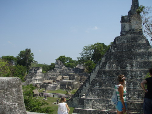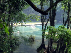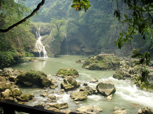 We komen aan bij Aguateca, een antieke Maya nederzetting aan de rand van de jungle. We worden rondgeleid door een spaanstalige gids. Eerst een hele voettocht door de jungle en dan komen we bij de tempels. Het is een mooie tocht en je waant je Indiana Jones bij het zien van de overwoekerde tempels. Deze plaats is echt buiten de gebaande paden en maar weinig bezoekers komen hier. Deze week zijn er al zes geweest. Het nadeel van deze plek is dat er totaal geen voorzieningen zijn. Dus geen stalletje met koele frisdranken of zo. Gelukkig hebben we zelf een flesje water meegenomen en de wandeling cq. klim, van 2 uur is zeker de moeite waard. Met de zelfde problemen en oplossingen varen en rijden we weer terug naar ons hotel in Flores. We nemen een koele duik in het zwembad en gaan 's avonds heerlijk uit eten in een van de beste restaurants. Dat kan hier makkelijk want de prijzen zijn erg laag (uit eten € 18 met zijn tweeen). Op zaterdag 11 mei vertrekken we vanuit Flores naar Coban voor een bezoek aan Semuc Champey. We hebben een mooi hotel geboekt midden in het centrum. Als het busje komt om ons naar Coban te brengen, zegt de chauffeur doodleuk dat wij de enige passagiers zijn en dat hij niet rijdt. Pim vraagt wat het kost om hem toch te laten rijden. Voor € 50 extra gaan we dan toch. Anders had het ons een extra hotelnacht gekost en het hotel in Coban was ook al betaald. Zo kiezen we dus eieren voor ons geld. De rit duurt 5 uur en om acht uur 's avonds komen we in het donker aan. De chauffeur is een echte zakenman, want hij vraagt naar onze plannen en weet te melden dat deze excursie de volgende morgen om 8 uur vertrekt. We rekenen gelijk € 90 met hem af zodat we dat ook weer geregeld hebben. De volgende morgen staat de bus inderdaad om 8 uur op de stoep. De bus haalt nog bij andere hotels gasten op en dan vertrekken we. Het laatste stuk gaat over onverharde bergwegen waarbij de bus uit elkaar lijkt te trillen. Af en toe maakt de bus een klap dat je denkt dat er nu toch wel ergens wat gebroken moet zijn. Semuc Champey is bekend doordat de rivier Cahabon hier onder een 300 meter lange limestone brug stroomt. Bovenop zijn er vijf grote poelen waar een deel van het rivierwater doorheen stroomt. Hier kun je heerlijk zwemmen en zijn er natuurlijke glijbaantjes van de ene naar de andere poel. We maken nog een mooie wandeling door de jungle. Het blijkt dat we een volledige tour geboekt hebben en we krijgen een lunchpakket uitgereikt. Dat komt mooi uit want er is hier verder niet zo veel. Een groepje van 5 fransen heeft geen lunch en zijn ook nog eens hun zwemkleding vergeten. We hebben nu ook nog een bezichtiging van een grot (inclusief) van een uur. Op de terugweg staan we ineens in een file van drie auto's op de berg. Er is een schoolbus vastgeraakt op een T-splitsing. Er is een grote krik waarmee de achteras opgekrikt kan worden. Met een pickup truck wordt er bij een dorpje even verderop vier grote brede balken gehaald om onder de wielen te stoppen. Met nog even een flinke duw van Pim rijdt de bus nu achteruit de weg op en kan iedereen weer verder. Terug in Coban is het al weer donker en gaan we maar snel ergens lekker eten. We blijven nog een dag hier, maar gaan wel naar een ander hotel. We vinden er een in het centrum met betere bedden en kussens voor slechts € 11. We slapen lekker uit en gaan Coban verkennen. Veel winkels en bedrijven schilderen zelf een plaatje op de muur voor reclame. Er is een levendige markt met van alles en nog wat. Het is mango tijd en er liggen echt hele bergen met mango's. Er is een kledingwinkel met kinderjurkjes voor € 0,30. Een andere zaak verkoopt spijkerbroeken voor € 1,50. Wel zijn ze versleten en met gaten erin, maar dat schijnt mode te zijn. Tijdens de terugrit met de zogenaamde kippenbus (dit is een bus voor de gewone man die van alles meeneemt), stapt er een rare snoeshaan in met gitaar. Het blijkt een zendeling te zijn. Eerst krijgen we een preek over Jesus Cristo en dan neemt de zingende pater (nee, niet Frater Venantius) zijn gitaar ter hand en steekt van wal.