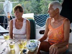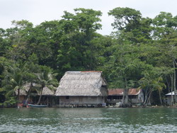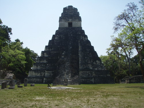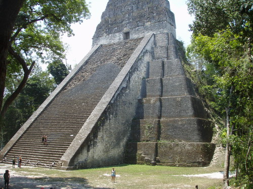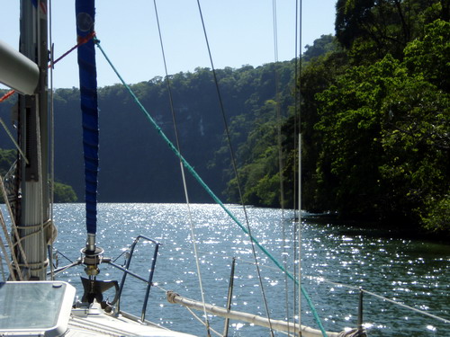 Guatamala april 2013: We zeilen met volle maan door de nacht naar Guatamala. De wind duwt ons voort en de zee is kalm, waardoor we goed kunnen slapen. De radar houdt de wacht, maar ziet de hele nacht geen scheepvaart. Volgens de getijde tabellen is het 's ochtends om 08:52 u. springtij en staat er 2 voet ( 60 cm) extra water. Zoals elke rivier heeft ook de Rio Dulce een drempel opgeworpen op het punt waar de rivier de zee in stroomt. Op deze drempel staat 5 voet water, dus nu plus 2 voet is 7 voet water. Er blijft voor de Panoramix dan nog halve voet (15 cm) water over tussen de onderkant en de rivierbodem. We zijn precies op tijd bij de riviermonding en we varen langzaam de drempel op. De dieptemeter begint af te tellen. Eerst nog een meter water onder de kiel, dan 50 cm, 40, 30, 20. Dat gaat goed zo, maar dan nog maar 10 cm en ook eventjes nul. Oeps.., als dat maar goed gaat. Over een afstand van zo'n 300 meter gaat de dieptemeter telkens van 10 naar 0, naar 10, naar 20, naar 10 cm. We raken geen enkele keer de grond en komen bij het plaatsje Livingston net achter de drempel weer in dieper water. Hier moeten we inklaren en er liggen nog 6 schepen met de gele douane vlag. Als we naar zee kijken zien we dat er een jacht met behulp van een bootje schuin getrokken wordt en zo over de drempel wordt gesleept. Gelukkig was dat bij ons niet nodig, scheelt weer $ 50 sleepkosten. Al snel komt er een bootje met de douane naar ons toe. Het inklaren gaat vrij snel en kost $ 180 met behulp van een agent 'Raul' van de firma Servimar. We moeten geld pinnen maar de automaten lusten onze pasjes niet. Dan maar naar de bank waar ik met de creditcard geld kan opnemen.Als we binnenkomen staat er een enorme rij en we besluiten later terug te komen. We gaan eerst terug naar Raul en vertellen hem dat we te weinig quetzals hebben en dat er heel veel mensen bij de bank waren voor bankzaken. Hij pleegt een telefoontje en we kunnen terug naar de bank waar we meteen geholpen worden.Je mag maar maximaal $ 200 opnemen en zo rest ons nog $ 20 (is 150 Quetzal). Achter het plafond heb ik nog $ 100 cash wat we nu ook maar omwisselen, zodat we in ieder geval even rond kunnen komen. Na een drankje en wat kleine boodschappen gaan we verder de rivier op. Je vaart door hoge steile wanden en de rivier slingert alle kanten op. Door die hoge bergen worden ook de orkanen tegen gehouden, waardoor de Rio Dulce een orkaanveilig gebied is. Als we door de gorges heen zijn, zien we een Nederlandse vlag aan een alluminium boot wapperen. Het zijn Dick en Petra op hun Sally Lightfoot, die we twee jaar eerder ontmoet hebben in Rubicon op Lanzarote. Met hen verkennen we alle kleine riviertjes, Maya (indianen)dorpjes en gaan we naar de heetwater bronnen. Dick en Petra hebben dezelfde dinghy als wij, maar dan nog een zeiluitrusting erbij. Het waait lekker en we crossen over de wijde rivier met het bootje. De dagen erna is er bijna geen wind. De lucht is 35 graden, het rivierwater is 34 graden en de luchtvochtigheid bijna 100% We zweten als otters en de ventilators in de boot maken overuren. In een kleine baai aan het meer 'El Golfete' gaan we met Dick en Petra uit eten in een lokaal restaurant dat nog maar net geopend is. Regelmatig komen er Maya indianen bij de boot langs. De kinderen voor een snoepje en de ouderen voor fruit of andere etenswaar. We gaan met ons bijbootje Idefix de omgeving verkennen. We gaan bij de bewoners langs die aan de oever hun hutje hebben. Er zijn zelfs vakantie resorts met allemaal appartementen op palen in de mangrove. Het is er allemaal even prachtig. Op de kleine zijriviertjes komen we van alles tegen. Mooie waterlelies, libelles, allerlei bomen en planten. Je vaart hier echt door het oerwoud onder overhangende takken. Af en toe moet je langs omgevallen bomen en takken in het water heen manouvreren. Hierna scheiden onze wegen. Wij gaan door naar Fronteras en Dick en Petra blijven nog wat rondtoeren. Fronteras is het grote marina gebied. Hier zitten wel zo'n 15-20 kleine marina's waar je de boot tijdens het hurricane seizoen veilig kunt achterlaten. Wij hebben een voordelige marina geboekt, maar willen ook wel even bij al die anderen kijken. Zo gaan we eerst een paar dagen naar Mario's. Dit schijnt de beste marina te zijn (ook de duurste) waar veel Amerikanen liggen. En waar Amerikanen zijn wordt er veel georganiseerd. Dus een radionet, happy hour, volleybal wedstrijd, BBQ avond, zwembad, tripjes en veel meer. Als we 's middags aan de steiger liggen gaan we meteen op zoek naar het zwembad en ja hoor, plons, bibber, bibber en we zijn meteen afgekoeld. Het water van het zwembad wordt koel gehouden door vers bronwater, waardoor het aangenaam zwemmen is. We gaan naar Isla Xalaja waar we een plaats besproken hebben tot november. Deze marina ligt op een eiland net naast het dorp en heeft 12 plaatsen voor boten. Je krijgt hier dus persoonlijke aandacht. Na twee dagen gaan we op weg voor onze eerste landreis door Guatamala. We gaan eerst naar het noorden, waar de grootste antieke Maya stad ligt. Lees hier meer over de Maya's en hier over de Mayacultuur. De luxe bus 'linea Dorade' rijdt ons in 4 uur tijd naar Flores. Hier hebben we een hotel met zwembad geboekt voor weinig geld. De volgende morgen rijden we met een shuttle bus in een uur tijd naar Tikal, de Maya ruines. We zijn al om 7 uur vertrokken om de ergste hitte overdag te vermijden. Tikal ligt midden in de jungle en onderweg zien en horen we een groep brulapen. Op het grote plein staan twee piramide tempels met hun kenmerkende dakkap en steile trappen tegenover elkaar. Het grote vlakke veld er tussen lijkt wel van een stadion zo groot. Aan de twee andere zijden staan de noord- en zuid acropolis. Het is een flinke stad geweest en we lopen heel wat uren rond. Het is intussen al flink opgewarmd als we bij de hoogste tempel aankomen. Met veel gepuf bereiken we de top en kijken zo over de uitgestrekte jungle uit. Bij een tempel zien we foto's van voor en na de restaura
