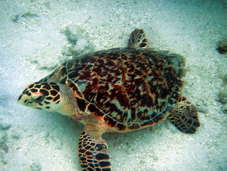 zwemt een schildpad. Het dier is niet bang en ik kan een paar close-up