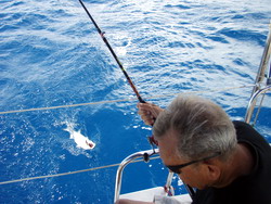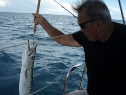 Oversteek Florida - Portugal : Op donderdag 30 april vertrekken we met goede westenwind naar de Bahama's. At wilde graag een AIS ontvanger om tijdens de oversteek te raadplegen. We hebben daarvoor een extra antenne gekocht en die achterop de Panoramix gemonteerd. Samen met een aangepaste Uniden scanner levert de AIS mooi plaatjes op van de schepen om je heen die een AIS zender hebben. Grote zeeschepen zijn verplicht om AIS signalen uit te zenden. Het idee is dat de radar dan uit kan blijven tijdens de oversteek en dat we de schepen netjes op de AIS zien. De AIS waarschuwt ook als de schepen te dichtbij dreigen te komen of op aanvaringskoers. Na een uur zeilen kijk ik eens naar voren en daar nadert een groot containerschip op nog geen halve mijl afstand. Zal je altijd zien dat het eerste schip dat we op zee tegenkomen geen AIS signaal uitzendt. Later komen we nog wat grote zeeschepen tegen en die verschijnen wel allemaal netjes op de AIS. Na zonsondergang varen we de Bahamas bank op. Hier is het slechts zo'n 5 meter diep. Gelukkig zijn er geen riffen of koraalkoppen op dit stuk zodat we in het donker door kunnen varen. 's Ochtends om 6 uur komen we aan op de ankerplaats en gaan even een tukje doen. Als we wakker worden, gaan we wat zwemmen en snorkelen. Het water is heerlijk 25 graden. De volgende dag gaan we de omgeving verkennen en ontmoeten zo een Amerikaan die alleen op zijn bootje hier rondtoert. De komende vier dagen is er harde oostenwind voorspeld en is een beschutte ankerplaats onontbeerlijk. We vullen onze dagen met zwemmen, kleine klusjes, zonnen, pannenkoeken bakken, lezen en gewoon luieren. Na twee dagen draait de wind nog iets en liggen we niet meer rustig op onze plek. We gaan 12 mijl zuidelijker naar een mooi omsloten baai die wel helemaal beschut is. We krijgen nog een dag met heel veel regen. De bijboot is half volgelopen zo veel is er gevallen. Als we de volgende morgen zijn opgestaan, merken we dat de wind gaat draaien. Wat eerder dan voorspeld, gaat de westenwind waaien en na het ontbijt lichten we het anker en gaan op weg naar Bermuda. Om van de Bahamas weg te komen, moeten we eerst nog door een labyrinth van riffen en ondieptes. Maar dan is er de oceaan en hebben we ruimte en diepte genoeg (tot wel 5km diep). Het is woensdag 6 mei en verwachten over een week aan te komen op Bermuda. De eerste twee dagen hebben we harde westenwind (windkracht 6). We gebruiken die om een stuk noordelijker van onze route uit te komen, omdat er daarna 6 dagen met lichte zuidenwind volgen. Voor de zeilers onder ons: met lichte wind kun je op de oceaan beter hoog aan de wind zeilen om snelheid en comfort te houden. Dagelijks volgen we de weerberichten en ons plan lijkt te slagen. Vrijdag 8 mei zijn we al zo'n 300 mijl onderweg (van de 770 mijl). At en ik proberen een visje voor het avondeten te vangen, maar vangen tot nog toe slechts drijvend wier. Als we om 7 uur een besluit moeten nemen over gekookte eieren bij de salade, treffen we bij het inrollen van de vislijn een uitgeputte bonito aan. Omdat het beestje niet al te groot is, hebben we hem niet opgemerkt. En zo eindigt de bonito dan tot ons genoegen een kwartier later op ons bord. Heerlijk...! De wind is inmiddels zuid en flink afgezwakt. Onze taktiek werkt en we kunnen met 6 knopen snelheid goed verder zeilen. We vissen alle dagen, maar vangen niets meer. Is de oceaan dan werkelijk leeggevist? Of bakken wij er niks van? Op deze route stroomt de oceaan met zo'n halve knoop noordwaarts. Dat betekent dat we in een week ruim 150 mijl (is 300 km) naar het noorden worden gezet. Om toch in Bermuda uit te komen, moeten we dus flink bijsturen. Vroeger was dit fenomeen niet bekend en raakten heel wat schepen de weg kwijt. Nu met onze GPS (satelietnavigatie) is er geen kunst meer aan. Je stuurt gewoon op de kaart waar je naar toe wilt. Dinsdag 12 mei is het dan zover en krijgen we Bermuda in zicht. Op een hele correcte Engelse wijze worden we ingeklaard bij de immigratie en de douane. Het eiland oogt erg Brits, maar is verder een gewoon Caribisch eiland. Wij liggen voor anker bij het dorpje St.George. Dit dorpje is het best bewaard gebleven en doet erg Engels aan. We kijken even in de supermarkt en zien dat de prijzen anderhalf tot tweemaal zo hoog zijn als in de USA. Omdat we dit van te voren wisten, hebben al flink ingekocht in Palm Beach. Nu hoeven we alleen wat eieren, groenten en vlees te kopen, zodat ons budget beperkt kan blijven. Wel trakteren we onszelf op een lekkere hamburger met frietjes voor €15! De hoofdstad Hamilton is per bus bereikbaar. We gaan er een middagje naar toe, maar vinden het niet erg interessant. Voor de cruiseschip passagiers is het een kopie van vele andere Caribische bestemmingen. Met veel souvernir-, diamanten-, horloge-, drank en andere dure winkels. Er liggen hier veel zeilers die op weg zijn naar Europa, waaronder 4 Nederlandse schepen. We raken aan de praat en wisselen verhalen en ervaringen uit. Vrijdag 15 mei is het weerbericht goed en vertrekken At en Pim voor het 1800 mijl (is 3240 km) lange traject naar de Azoren. Een tocht van zo'n 15 dagen. Net voor we vertrekken, raakt onze laatste gastank leeg. De gastanks zijn nog van campinggaz en dat is hier niet te krijgen. We raken aan de praat met Elsa en Jaap op hun boot Sark uit Marken. Zij hebben een gastankje, dat we kunnen overnemen. Tja, we willen nog wel graag koken onderweg. Vanaf de Azoren is campinggaz weer verkrijgbaar en lost het probleem zich vanzelf op. We vertrekken met flinke noordenwind en moeten weer even inslingeren de eerste dag. We houden de eerste dagen nog deze wind en schieten daardoor goed op. Op de vierde dag zullen we worden ingehaald door een depressie (lagedruk gebied) met een hoop wind, windkracht 7-8. Op een tocht van 15 dagen is het nu eenmaal onvermijdelijk dat er een keer een depressie overkomt. Maar deze depressie staat al in de weerkaarten en ligt best wel gunstig. Om de harde wind te vermijden, sturen we de Panoramix naar